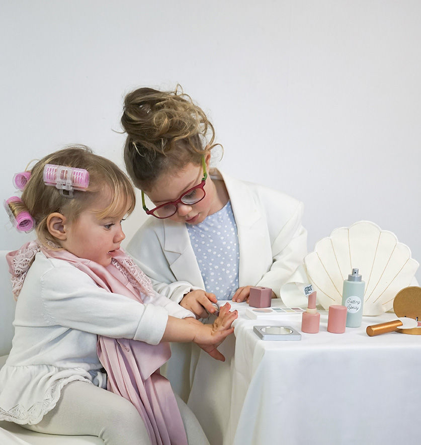 Vitajte v salóne krásy! Ako sa chceš dnes nalíčiť? Make-up opasok od Jabadabado obsahuje všetko, čo potrebujete, aby ste sa stali skutočnou malou vizážistkou. Teraz môžete pred večierkom upraviť štýl všetkých svojich zákazníkov. Nalakujte nechty, naneste lícenku a očné tiene, pred dokončením rúž a fixačný sprej. Pozrite sa do zrkadla a ukážte skvelý výsledok. S make-up opaskom môžete svoj make-up jednoducho nosiť so sebou, kamkoľvek idete. Opasok má tvar roztomilej mušle.